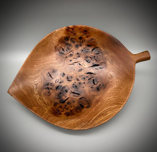 Description SOLD Round 'Leaf Bowl' Kenny Woods Hand-carved burr Elm dish with tung oil finish 23 x 17 x 4 cm